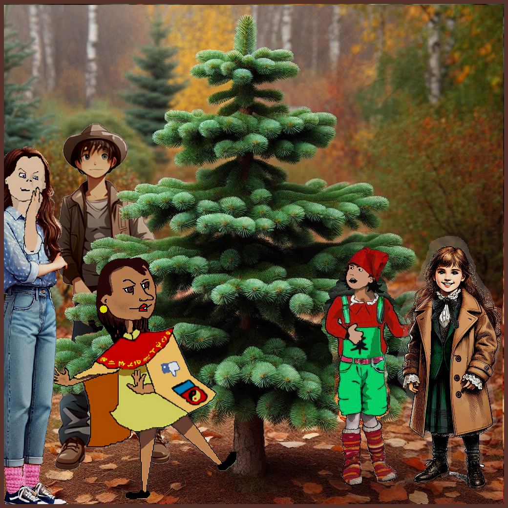 On Wednesday afternoon, right after school, Skinny Jimmy held an ax in his hand while the girls followed him into a wooded area down the block from Cathy and Jan’s house. Karma carried a saw. Erin pulled along a wagon over clumps of winter grass and crackling dead leaves. Once they found the tree they all thought would do, Erin would wheel it out of the woods. For now, Janice sat happily in the wagon, enjoying the adventurous ride. The afternoon had a bright, sun-filled sky, yet the air remained still and chilly. As is often the situation, snow always falls in the Christmas Village. However, it doesn't always snow around their hometown. On this afternoon, the wooded area did not have a flake of snow in it. The crisp scent of fallen leaves and pine needles filled the air, mingling with the occasional whiff of damp earth. Big trees stood tall, but smaller ones hid behind others, bushes, and tall grass—a perfect place to play hide-and-seek! You might never be seen or even found around here. But finding the right tree came hard. Everyone spread out in different directions, yet it seemed that every time one of the kids thought they had found the right tree, and all the others came running to inspect it, it turned out wrong. Too big, too small, not an evergreen, too many branches, not enough branches. After an hour or more, they were tired and took a break beside another tree that failed inspection.