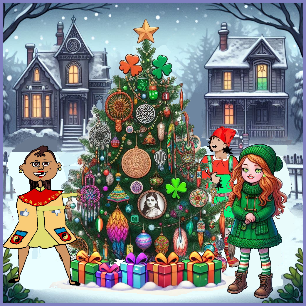 Back in Jan’s bedroom, she, Erin, and Karma felt so excited about Jan’s idea to place a Christmas tree in front of the Empty House. Each girl had her own idea of how the tree might look and how to decorate it. Karma’s family does not celebrate Christmas, so having a tree to decorate thrilled her. She would borrow pictures and trinkets found around her family’s house for decorations—things like peacock feathers, jingle bells, and holy statues! Erin laughed at that thought. “Nothing is as fancy and bright as an Irish Christmas. Let’s decorate it with shamrocks, green ribbons, and little Irish harps!” They all giggled when Jan suggested covering it with American flags, dreamcatchers, and lots and lots of colorful strings of beads.