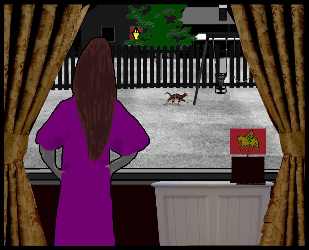 Cathy again looked out her window. She searched the starry skies. A crescent moon lite up a tiny cloud, but nothing, not even a stray moth could be seen from her window. She looked across her neighborhood, no Sleepies. She looked down into her backyard. Except for Belgium the Cat, nothing moved. She turned to sit in the window and thought what to do.